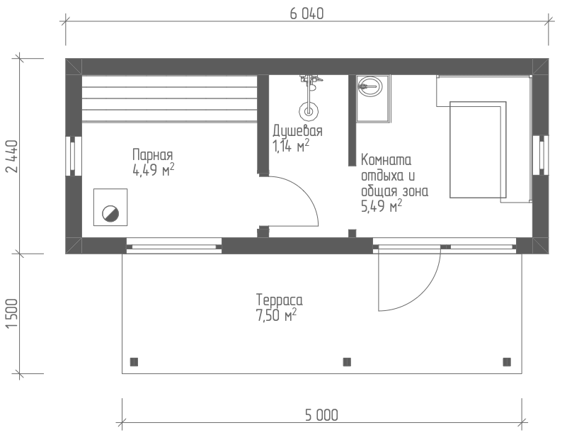 Формат 6×4 м — это оптимальный баланс между компактностью и комфортом. Площадь около 24 м² позволяет разместить полноценную парную, душевую, комнату отдыха и дополнительно — открытую террасу для отдыха на свежем воздухе.
